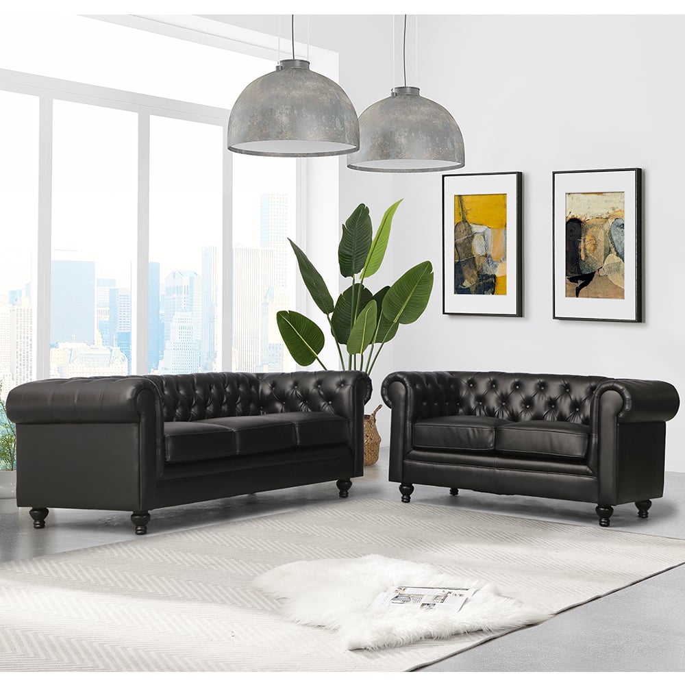 The Hertford Faux Leather 3+2 Seater Sofa Set in Black is a stylish and comfortable seating solution for any living space. The sleek and modern design of this sofa set is sure to elevate the look of any room, and the high-quality faux leather upholstery provides a premium feel and is easy to clean. The Black color of the set adds a touch of sophistication to the room, making it a great choice for anyone who wants to create a stylish and comfortable space. The spacious seating areas and comfortable cushions of both the 3 seater and 2 seater sofas make this set perfect for lounging, watching TV, or simply relaxing after a long day. Whether you’re looking to create a cozy seating area in your home or a functional and stylish piece for your office, the Hertford Faux Leather 3+2 Seater Sofa Set is an excellent choice. Furniture in Fashion offers a wide range of home furnishings to meet your every need, and this sofa set is just one of the many products available to you. FEATURES : Material : Bonded Leather, Faux Leather, Foam and Fibre, Solid Hardwood (Rubberwood) Finish : Black, Dark Wood Stain Hertford Chesterfield Faux Leather 3 Seater And 2 Seater Sofa In Black High quality Bonded leather Primary upholstery with Faux leather on sides and back Secondary upholstery Foam and fibre wrapped pocket springs seat cushion with fibre back cushion Serpentine springs seat base Frame material is poplar frame and panels Screwed and reinforced with corner blocks frame construction Feets are made from solid hardwood (Rubberwood) in dark wood stain finish Available at an Affordable Price Images shown are for illustration puspose only 2 SEATER SOFA DIMENSIONS : Height : 84cm Width : 160cm Depth : 74cm 3 SEATER SOFA DIMENSIONS : Height : 84cm Width : 215cm Depth : 74cm