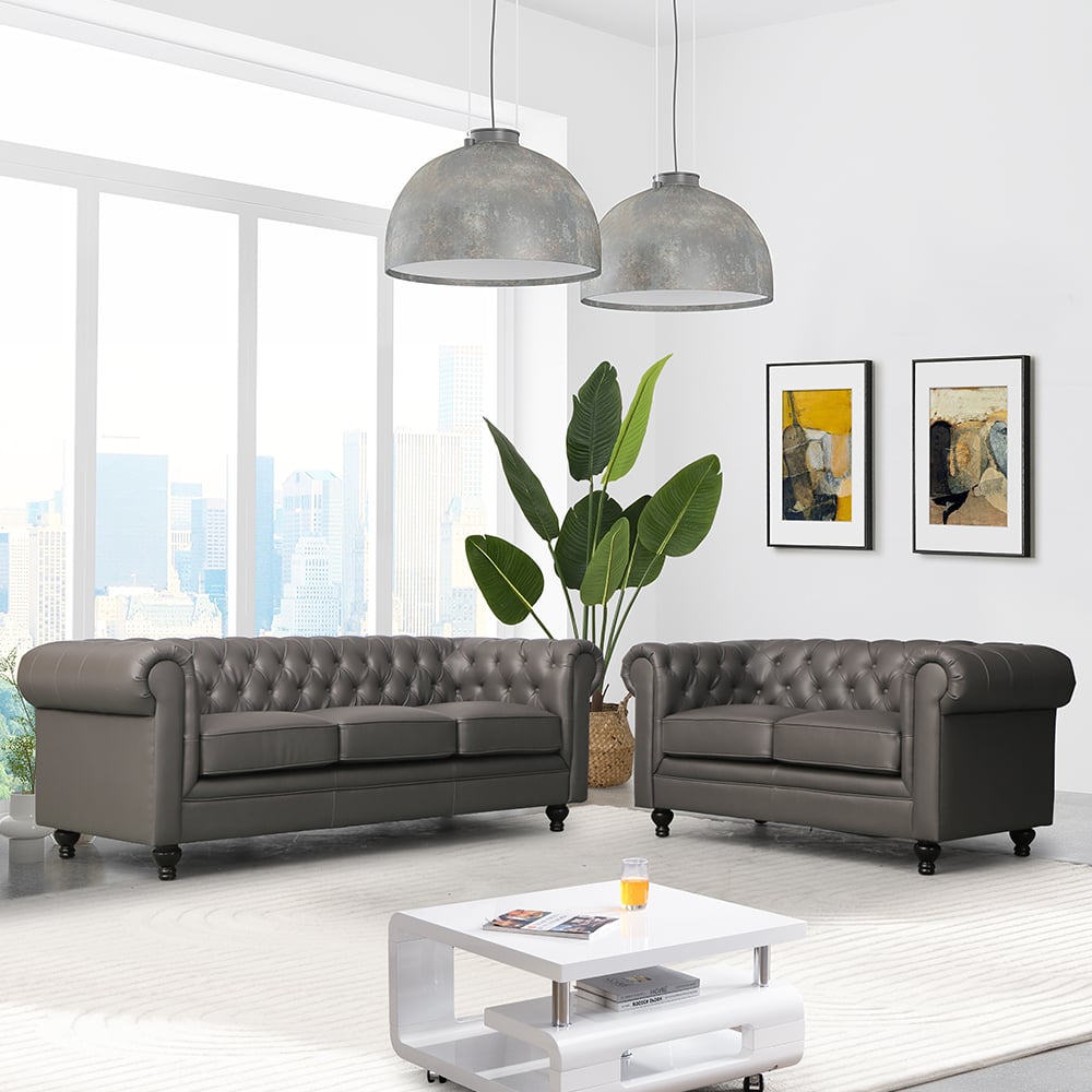 The Hertford Faux Leather 3+2 Seater Sofa Set in Dark Grey is a stylish and comfortable seating solution for any living space. The sleek and modern design of this sofa set is sure to elevate the look of any room, and the high-quality faux leather upholstery provides a premium feel and is easy to clean. The dark grey color of the set adds a touch of sophistication to the room, making it a great choice for anyone who wants to create a stylish and comfortable space. The spacious seating areas and comfortable cushions of both the 3 seater and 2 seater sofas make this set perfect for lounging, watching TV, or simply relaxing after a long day. Whether you’re looking to create a cozy seating area in your home or a functional and stylish piece for your office, the Hertford Faux Leather 3+2 Seater Sofa Set is an excellent choice. Furniture in Fashion offers a wide range of home furnishings to meet your every need, and this sofa set is just one of the many products available to you. FEATURES : Material : Bonded Leather, Faux Leather, Foam and Fibre, Solid Hardwood (Rubberwood) Finish : Dark Grey, Dark Wood Stain Hertford Chesterfield Faux Leather 3 Seater And 2 Seater Sofa In Dark Grey High quality Bonded leather Primary upholstery with Faux leather on sides and back Secondary upholstery Foam and fibre wrapped pocket springs seat cushion with fibre back cushion Serpentine springs seat base Frame material is poplar frame and panels Screwed and reinforced with corner blocks frame construction Feets are made from solid hardwood (Rubberwood) in dark wood stain finish Available at an Affordable Price Images shown are for illustration puspose only 2 SEATER SOFA DIMENSIONS : Height : 84cm Width : 160cm Depth : 74cm 3 SEATER SOFA DIMENSIONS : Height : 84cm Width : 215cm Depth : 74cm