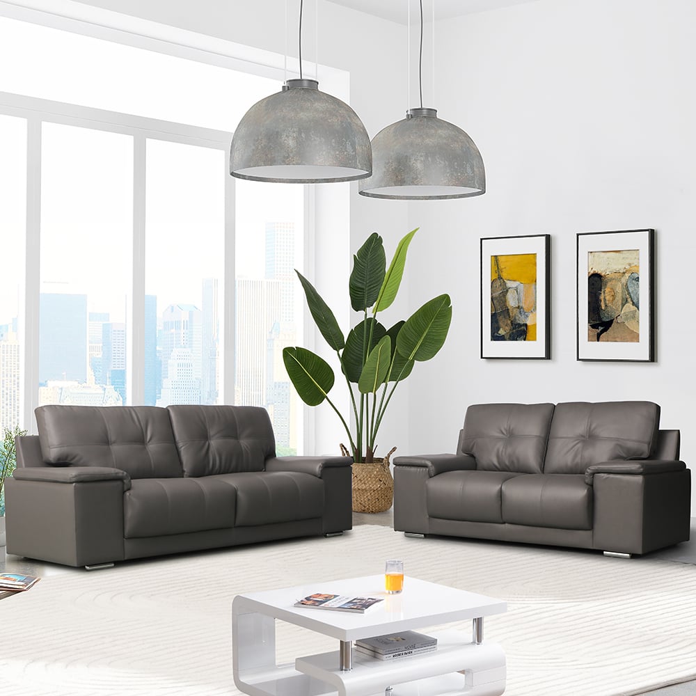 The Kensington Faux Leather 3+2 Seater Sofa Set in Dark Grey is a stylish and comfortable seating solution for any living space. The sleek and modern design of these sofas is sure to elevate the look of any room, and the high-quality faux leather upholstery provides a premium feel and is easy to clean. The dark grey color of the sofas adds a touch of sophistication to the room, making it a great choice for anyone who wants to create a stylish and comfortable space. The spacious seating area and comfortable cushions of the sofas make it perfect for lounging, watching TV, or simply relaxing after a long day. Whether you’re looking to create a cozy seating area in your home or a functional and stylish piece for your office, the Kensington Faux Leather 3+2 Seater Sofa Set is an excellent choice. Furniture in Fashion offers a wide range of home furnishings to meet your every need, and this sofa set is just one of the many products available to you. FEATURES : Material : Bonded Leather, Faux Leather, Foam and Fibre, Metal Finish : Dark Grey, Silver Chrome Kensington Faux Leather 3 Seater And 2 Seater Sofa In Dark Grey High quality Bonded leather Primary upholstery with Faux leather on sides and back Secondary upholstery Foam and fibre wrapped pocket springs seat cushion with fibre back cushion Serpentine springs seat base Frame material is poplar frame and panels Screwed and reinforced with corner blocks frame construction Feets are made from metal in silver chrome finish Available at an Affordable Price Images shown are for illustration puspose only 2 SEATER SOFA DIMENSIONS : Height : 86cm Width : 184cm Depth : 90cm 3 SEATER SOFA DIMENSIONS : Height : 86cm Width : 225cm Depth : 90cm